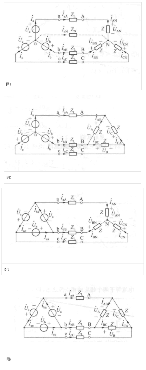 三相电源及三相负载都有星形和三角形两种连接方式,当三相电源和三相负载通过输电线(其阻抗为ZL)连接构成三相电路时,可形成五种连接方式,分别称为Y0—Y0联结(有中线)、Y—Y联结(无中线)、Y一△联结、△一Y联结和△一△联结,分别如图1~4所示,其中图1所示中存在两个中点,中点之间可连接输电线(中线,其阻抗为ZN),称为三相四线制方式,图2~4中只有三根输电线,不存在中线,称为三相三线制方式。